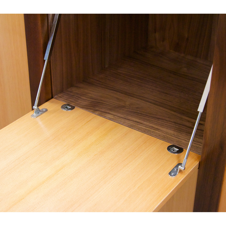 This cabinet was designed as a multi-purpose storage cabinet for a lounge/dining room. It incorporates drawers, adjustable shelves behind the doors and a fold down bar section. The doors, drawers and fold down bar section are all push to open.
